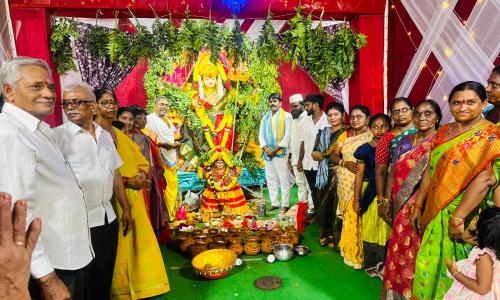 తెలుగు వెలుగు టీవీ - వార్తలు / కొత్తగూడెం : కొత్తగూడెం పట్టణంలో గల శ్రీనగర్ కాలనీ నందు మండపంలో కొలువుదీరిన దుర్గామాతను టిపిసిసి జనరల్ సెక్రెటరీ నాగాసీతారాములు దర్శించుకున్నారు . ఈ సందర్భంగా నిర్వాహకులు ఆయనకు ఘన స్వాగతం పలికారు . అనంతరం నాగాసీతారాములు ప్రత్యేక పూజలు నిర్వహించారు . ఈ సందర్భంగా ఆయన మాట్లాడుతూ అమ్మ దయతో ప్రజలందరూ సుఖ సంతోషాలతో , ఆయురారోగ్యాలతో , అష్టఐశ్వార్యాలతో వర్దిల్లాలని ఆకాంక్షించారు . అనంతరం నిర్వాహకులు ఆయనకు శాలువా కప్పి ఘనంగా సన్మానించారు . ఈకార్యక్రమంలో ఓబిసి పట్టణ అధ్యక్షులు అమడగాని.జయప్రకాష్, ఓబీసీ జిల్లా సెక్రెటరీ బొబ్బల.వెంకట్ యాదవ్,మైనారిటీ టౌన్ సెక్రటరీ ఖాదర్ భాయ్,యువజన నాయకులు బన్ను,రాజగోపాల్ స్థానిక కమిటీ నిర్వాహకులు,భక్తులు పెద్ద ఎత్తున పాల్గొన్నారు.