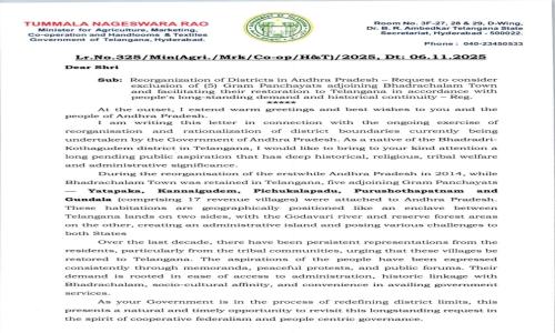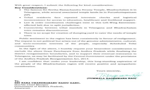 తెలుగు వెలుగు టీవీ - వార్తలు / కొత్తగూడెం : ఏపీలో జిల్లాల పునర్విభజన నేపథ్యంలో లేఖ• భద్రాద్రి రాముడు తెలంగాణలో శ్రీ రాముడి భూములు ఆంధ్రాలో.•పరిపాలనా సమస్యలు,గిరిజనుల ఇబ్బందులు•డంపింగ్ యార్డ్ కు సైతం స్థలం లేని దుస్థితి •చారిత్రక అనుబంధం ప్రస్తావించిన మంత్రి తుమ్మల.కేంద్ర హోం శాఖ మంత్రి అమిత్ షా , తెలుగు రాష్ట్రాల ముఖ్యమంత్రులు చంద్రబాబు రేవంత్ రెడ్డి లకు తెలంగాణ వ్యవసాయ శాఖ మాత్యులు తుమ్మల నాగేశ్వరరావు బుధవారం కీలక లేఖ రాశారు. ఆంధ్రప్రదేశ్లో జిల్లాల పునర్విభజన నేపథ్యంలో భద్రాచలం పరిసర ఐదు గ్రామాలను తెలంగాణ రాష్ట్రంలో కలపాలని, పునర్విభజన చట్టంలోని ఉభయ రాష్ట్రాల చర్చల సందర్భంగా ఈ అంశాన్ని సానుకూలంగా చర్చించి తెలుగు ప్రజల ముఖ్యంగా భద్రాద్రి, ఐదు గ్రామాల ప్రజల తీరని వేతలు తీర్చేలా ప్రత్యేక చొరవ చూపాలని మంత్రి తుమ్మల విన్నవించారు. పునర్విభజన చట్టంలోని భద్రాచలం పట్టణాన్ని ఆనుకుని ఉన్న యాటపాక, కన్నాయిగూడెం, పిచుకలపాడు, పురుషోత్తపట్నం, గుండాల పంచాయతీలను తిరిగి తెలంగాణ రాష్ట్రానికి చేర్చే అంశాన్ని పరిశీలించాలని కేంద్ర ప్రభుత్వాన్ని మంత్రి తుమ్మల నాగేశ్వరరావు కోరారు. భద్రాచలం చారిత్రక అనుబంధం....తుమ్మల లేఖలో పేర్కొన్న వివరాల ప్రకారం—2014 రాష్ట్ర విభజన సమయంలో భద్రాచలం పట్టణం తెలంగాణలోకి వచ్చినప్పటికీ, దీని చుట్టుపక్కల ఉన్న ఐదు గ్రామ పంచాయతీలను ఆంధ్రప్రదేశ్లో కలిపారని పేర్కొన్నారు. గిరిజనుల కష్టాలు — అంతర్రాష్ట్ర తనిఖీలు. ఈ గ్రామాల ప్రజలు, ముఖ్యంగా ఆదివాసీ కుటుంబాలు, ఆరోగ్యం–విద్య–రవాణా వంటి అవసరాల కోసం సహజంగానే భద్రాచలం పైనే ఆధారపడుతున్నారని తుమ్మల వివరించారు.అయితే రాష్ట్ర సరిహద్దు మార్పుతో ప్రతి చిన్న పనికీ అంతర్రాష్ట్ర తనిఖీలు,వైద్య అత్యవసరాల్లో ఆలస్యం,పాఠశాలలు, హాస్టళ్లకు చేరడంలో ఇబ్బందులు,అభివృద్ధి పనుల్లో అధికార పరిధి గందరగోళం లాంటివి ప్రజలను తీవ్రంగా వేధిస్తున్నాయని మంత్రి తుమ్మల వెల్లడించారు.తీవ్రవాద ప్రభావిత ప్రాంతం – సమన్వయ లోపంఈ మండలాల పరిధి ఎల్డబ్ల్యూఈ (LWE) సున్నిత ప్రాంతం కావడంతో శాంతిభద్రతల సమన్వయంలో రెండు రాష్ట్రాలకు సవాళ్లు పెరిగాయని తుమ్మల తన లేఖలో స్పష్టం చేశారు. పరిపాలనా సులభతరం కోసం ఈ ప్రాంతం ఒకే రాష్ట్రానికి చెందడం ఉత్తమమని ఆయన అభిప్రాయపడ్డారు.దేవస్థానం భూములు ఏపీలో ....ప్రసిద్ధ భద్రాచలం శ్రీ సీతారామచంద్ర స్వామి ఆలయం తెలంగాణలో ఉండగా, అనుబంధ ఆలయ ఆస్తులు, భూములు పురుషోత్తపట్నం ఆంధ్రప్రదేశ్లో ఉండటం వల్ల రికార్డులు, పరిపాలన, అభివృద్ధి ప్రణాళికల్లో చిక్కులు ఎదురవుతున్నాయని తుమ్మల పేర్కొన్నారు.డంపింగ్ యార్డ్, ఇతర దేవాలయ అవసరాల కోసం భూములు అందుబాటులో లేక తీవ్ర ఇబ